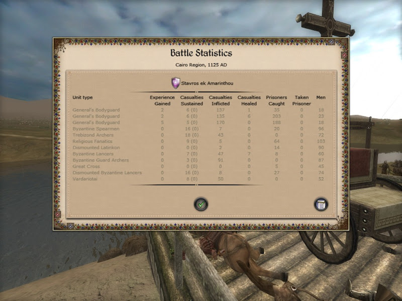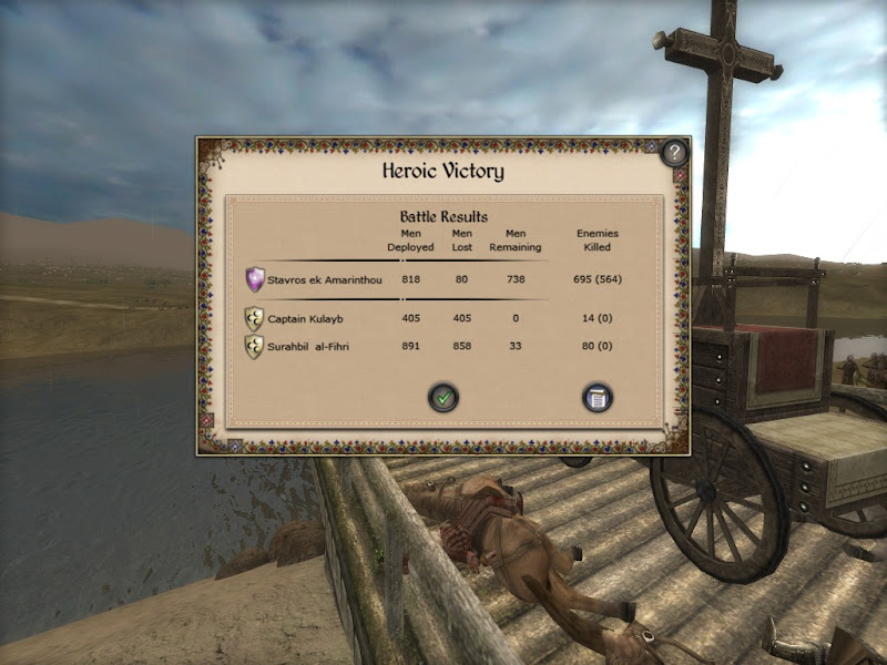 Vissarionas saw their renewed determination, and immediately saw what must be done to break it. Commanding his men to ignore and ride through the Turkomen, breaking their ranks and their will to fight along the way, Vissa charged onto the bridge behind the Saracen heavy infantry. Charging into the backs of the well armored Saracens the lances of the Byzantine bodyguard made a terrific noise. Virtually the entire remaining Fatamid force turned to see a Greek banner at their backs, remorselessly churning a path into their heaviest remaining troops. It was too much. Hundreds of them threw down their swords by the Great Cross and surrendered while a very few trickled through or jumped into the river to attempt to escape.