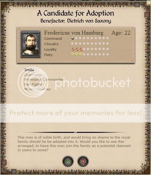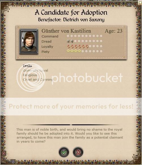 These adoptions have reminded me that Bavaria isn't part of the royal family yet. This might cause problems because we won't ever get adoptions or new members by birth until we are part of the family. Presumably, the underaged daughter will be married to either Otto or Max to resolve this, but there are lots of ways this could go awry. First, Heinrich could die before she comes of age, thus preventing her from being a princess and therefore Max and Otto wouldn't be able to marry her. Second, both Max and Otto could die before she comes of age. This is unlikely, but possible.