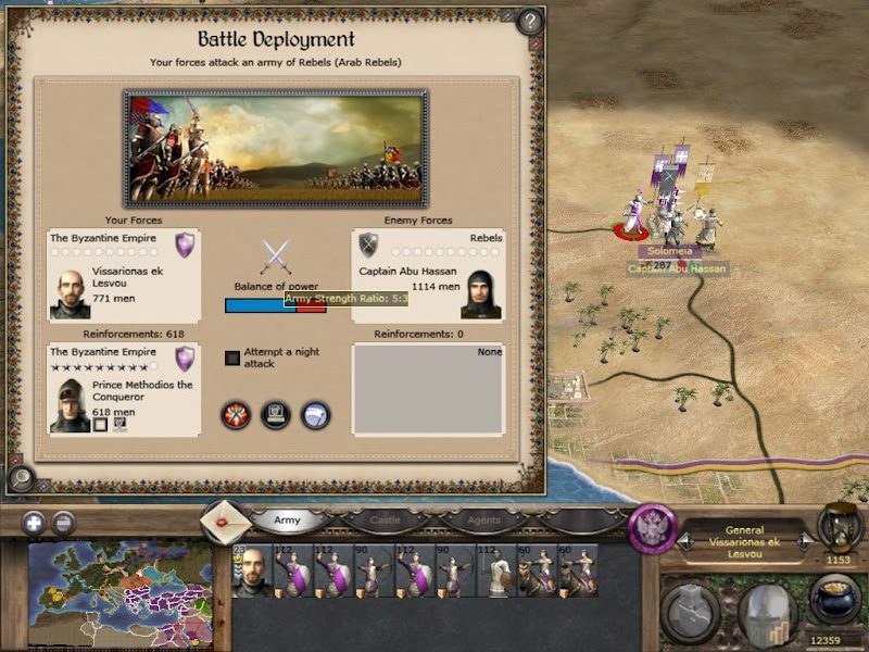 Ioannis, his veteran warrior, looked up from the map table and gave his report. "Alright, you, Brother Bart, and 2 units of spear militia are in the city. Brother Nathanail sailed north and has just arrived outside the wall. He has been joined by Marshall Armatos. The Marshall brought both units of horse archers from the Order's army. The peasant archer on the way to the army was turned around and has made it back. The Marshall took the money you gave him and hired 2 units of Turcopoles. Kalameteros took the money you gave him and hired 2 units of Armenian Cavalry and a unit of Alan Cavalry. He sent them towards us and they have arrived not long ago. We have a total of 808 men. Everyone is ready."