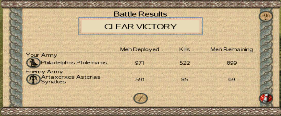 Philadelphos Ptolemaios started off with the ability to take the high ground and took it. Advancing on the enemy, he could use his cavalry superiority to hammer-and-anvil the enemy until they fled. Most casualties were suffered amongst the phalangites, especially so for those on the right flank; the light infantry suffered very little casualties, and - aside from some of Philadelphos' bodyguards in his battle with Sositratos Termessou Pisidikes - his cavalry survived without a single loss.