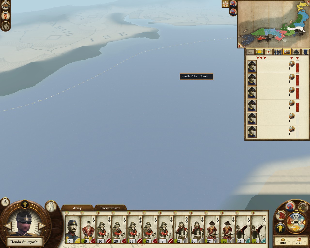 Army replenishment rates are punitive. Our precious starting samurai units can only replace 5 men per turn. Including them in the heaviest areas of combat is critical to our success, so this slowness makes our situation quite fragile. We need access to a dojo ASAP. My original thought was to place the dojo in Hitachi as that will make it easy to load new units onto ships ... but it might be nice to have a dojo prior to taking on the Jozai. Our starting province still has a semi-useless police station; I'm tempted to demolish it and replace it with either a dojo or an income building.
