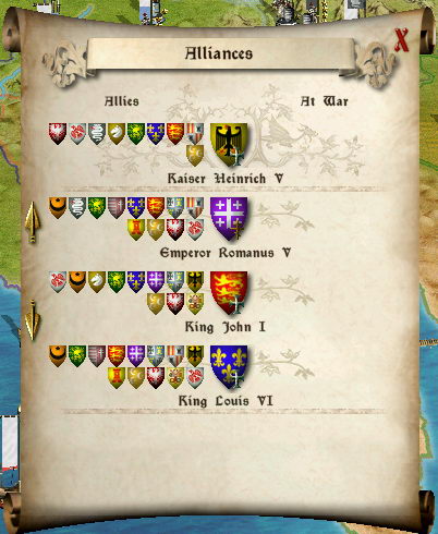 Nice campaign and description, Stazi. I've often seen this "cold war" type buildup -- with each faction jockeying for a better position at the expense of the rebels. If you make the first move against another Christian (or even Muslim) faction, expect most of your allies to desert you. Yes, those Flemish infantry are quite superb, aren't they? Personally, I've found royal spearman to be overpriced and underperforming by comparison. They always seem to die in droves, while doing no more damage, seemingly, than the less professional units such as Frankish spearmen. Flemish spears, when you can get them, are the way to go.