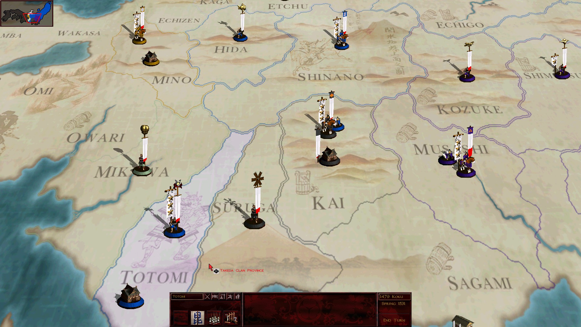 So, that worked pretty well. The Imagawa Clan was actually defeated T2, since Yoshimoto was in Suruga, and Takeda attacked Suruga T2 as well. Since the battle in Totomi is resolved first, and I won it, the Daimyo had nowhere to run. So, here's Winter 1531: